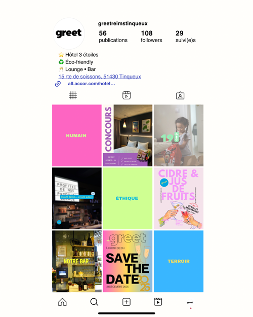Dans le cadre de ce projet, j’ai pris en charge la communication réseaux sociaux du Greet Hôtel Tinqueux. Mon rôle a consisté à concevoir et mettre en œuvre une stratégie digitale adaptée à l’identité de l’établissement.
